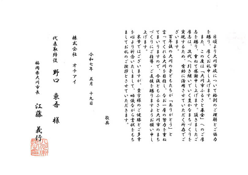 その感謝の思いを形にするため、2024年に続き2025年も本制度を通じて大川市へ寄付を実施し、大川市ご担当者様より御礼状を頂戴いたしました。