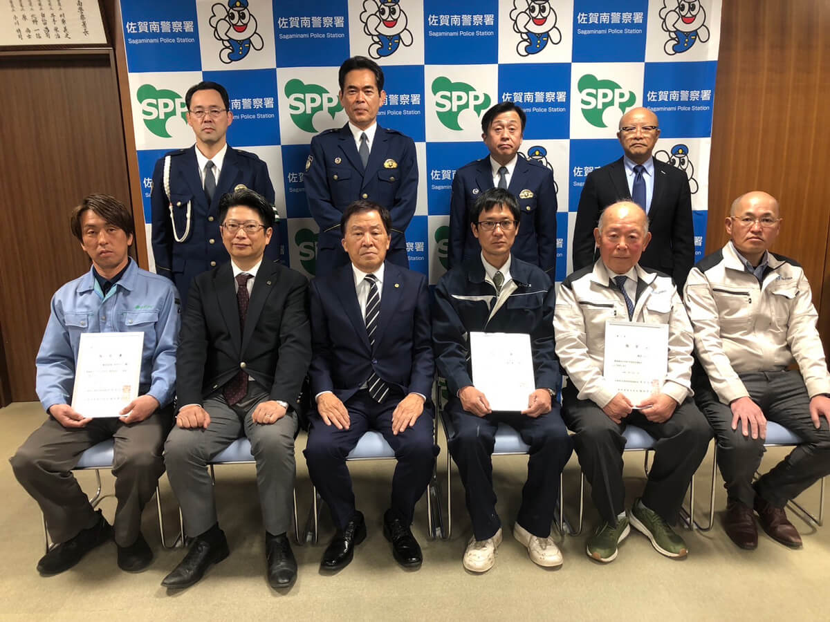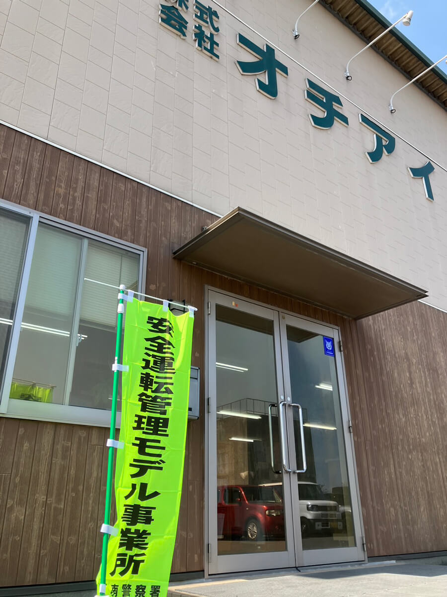 4月3日に佐賀南警察署で交付式が行われ、“指定書”と“安全運転管理モデル事業所”のぼり旗を受け取りました。