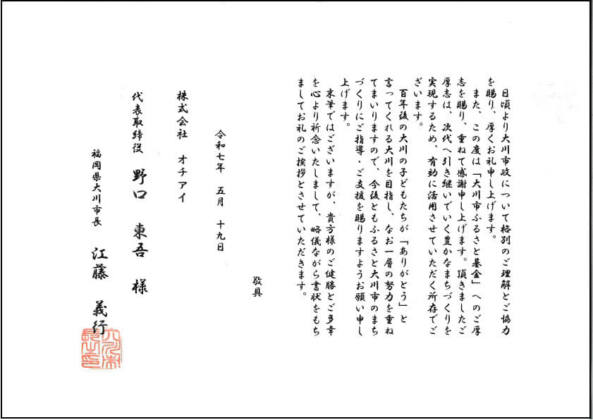 そのお礼として、大川市のご担当者様より御礼状を頂きました。
