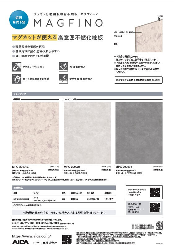 『マグフィーノ』 マグネットが使える高意匠不燃化粧板